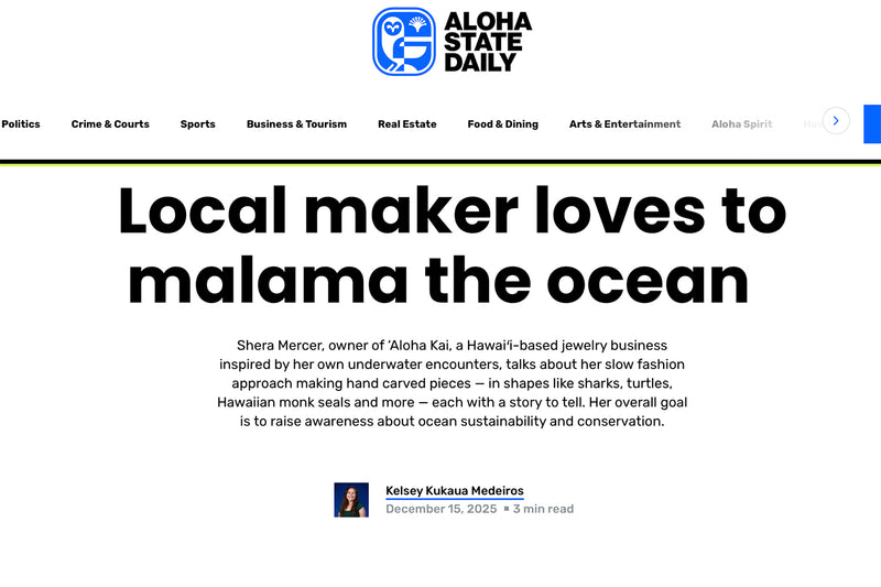 "Local maker loves to malama the ocean" Article by Kelsey Kukaua Medeiros. Aloha State Daily is an online-only news publication covering events and culture in the State of Hawaii.